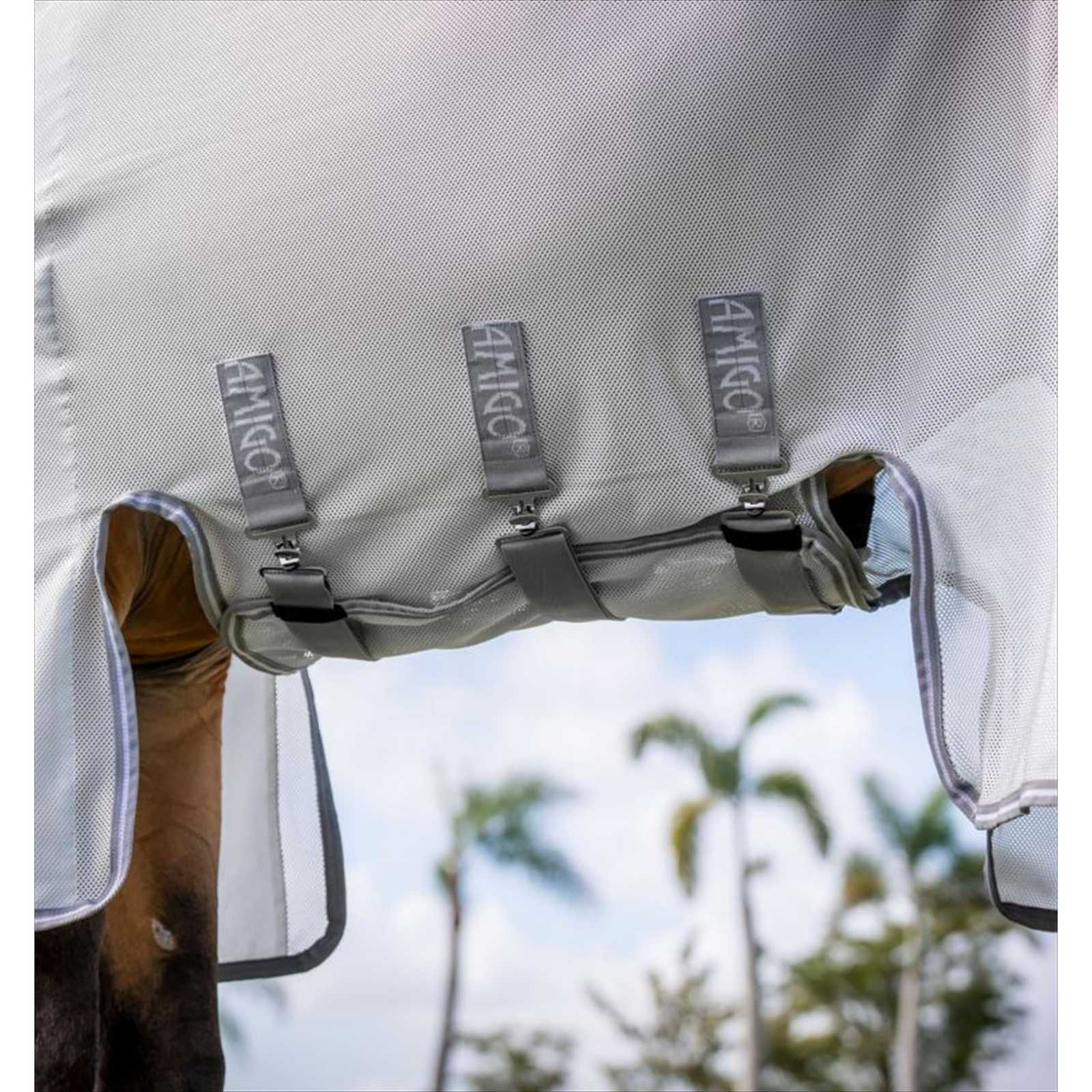 Sie ist aus robustem, leichtem, dicht gewebtem Mesh mit 65 % UV-Schutz gefertigt und hält Insekten fern. Der extra breite Bauchlatz deckt den empfindlichen Bauchbereich ab und wird durch drei gerade Gurte mit Klettverschluss gesichert. Die Beinausschnitte hinten und vorne schenken Bewegungsfreiheit, während das glanzgebende Futter im übergroßen Schweiflatz sowie im Schulter- und Mähnenbereich die Haut gesund erhalten.