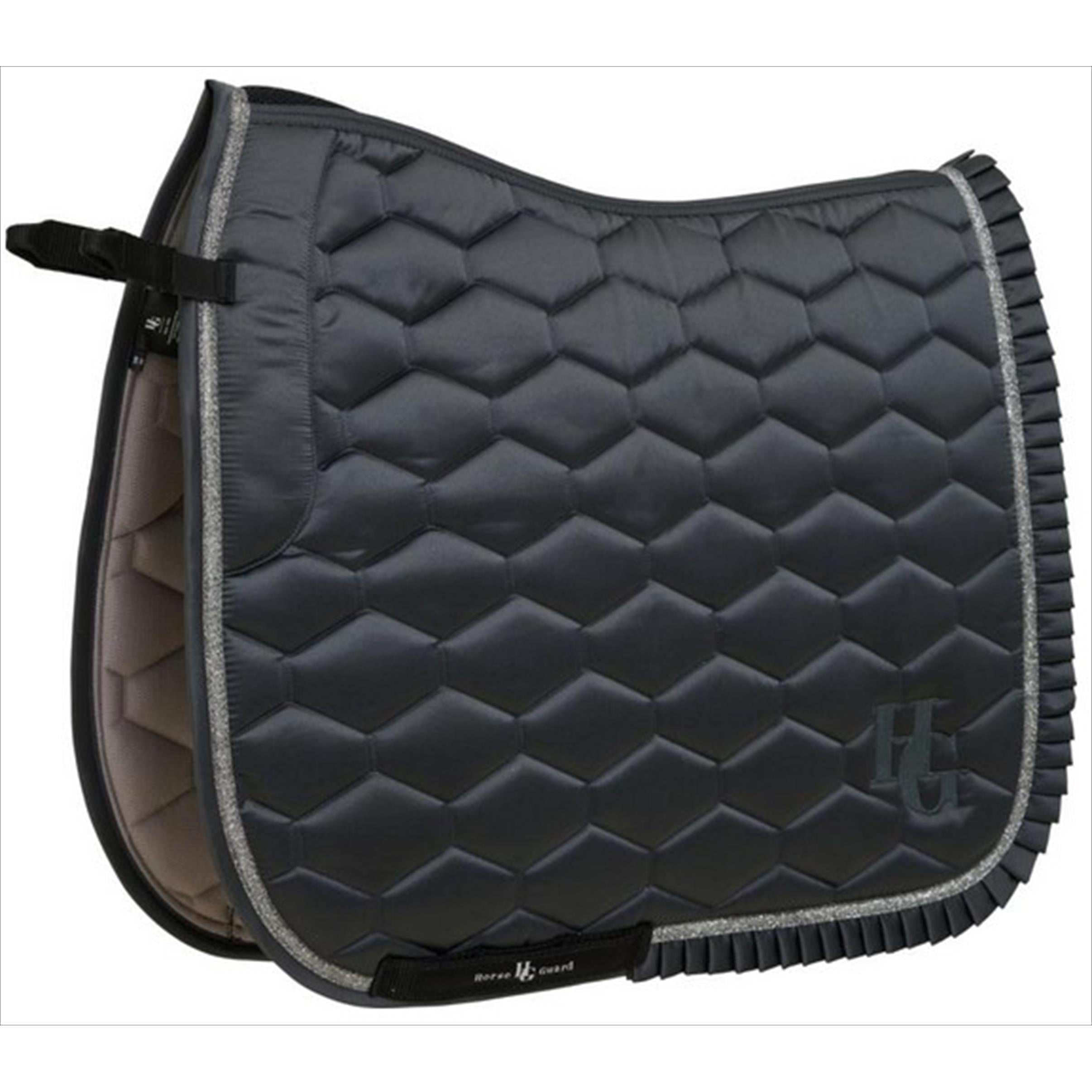 Sattelunterlage aus glänzendem Stoff mit dekorativen Verzierungen.
