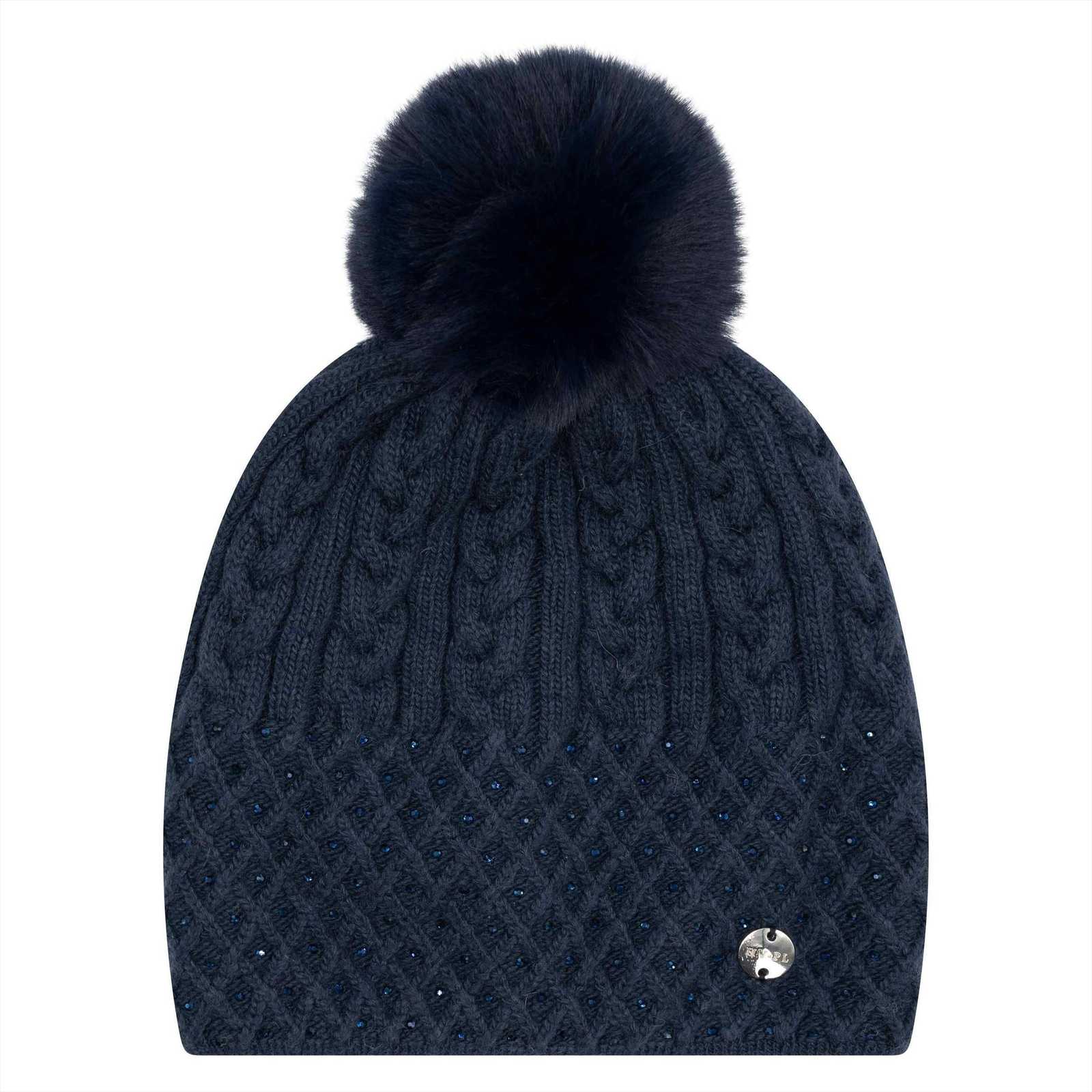 Gestrickte Mütze mit Bommel und Glitzerdetails.